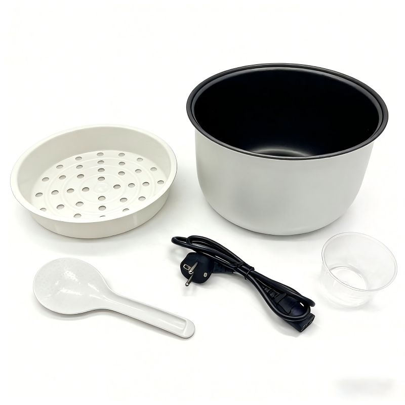 Accessories – This rice cooker includes a non-stick inner pot, rice measuring cup, steam tray, and a plastic rice spatula.